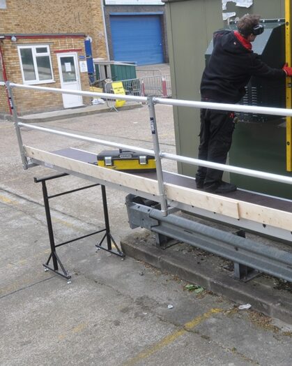 The platform surface is non-slip phenol-faced plywood. Giving you extra foot grip in wet weather. Our staging boards come with the added benefit of optional handrail systems for extra security.